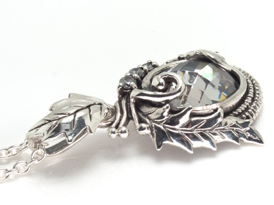 大粒の多面カットCZをツタとリーフのモチーフで取り囲み、アクセントに3粒のCZをセットしたペンダント。ゴージャスなきらめきと、中世ヨーロッパを思わせる、アンティークで華やかなデザインが胸元を飾ります。(チェーンは別売りです)